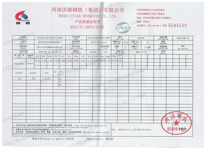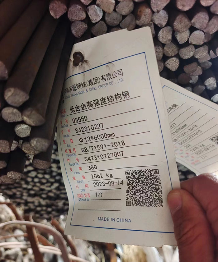 圖為:Q355D材質(zhì)直徑12mm產(chǎn)品出廠標(biāo)簽